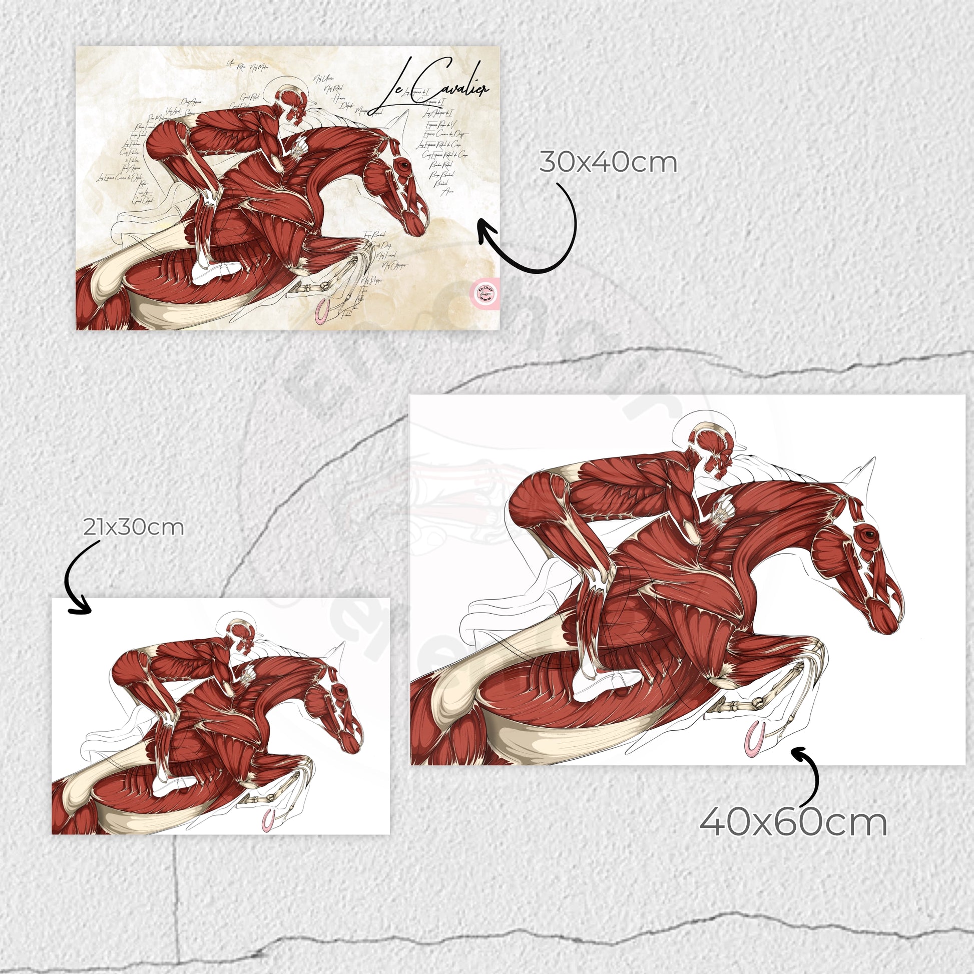 Cette planche anatomique du cavalier fera bon mélange entre votre passion pour la santé et le monde équin. Sans erreur anatomique grâce au travail de Chloé Aubry, paléontologue, vous pourrez vous servir de ce poster aussi bien pour vérifier vos connaissance anatomique humaine que vos connaissance de l'anatomie des muscles du cheval.